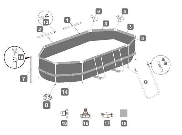 - Materiaal zwembad: DuraPlus: PVC, PE gaas