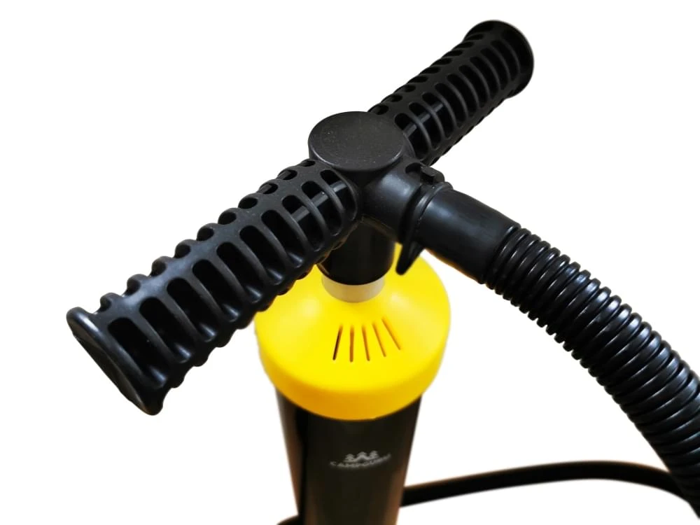 De Double Action Luchtbedpomp staat stevig op de grond wat zorgt voor stabiliteit en de hendel biedt een goede grip zodat er de nodige kracht kan worden gezet. De werkingsdruk van de pomp komt neer op 0,3 bar. De pomp wordt geleverd met verschillende koppelstukken.