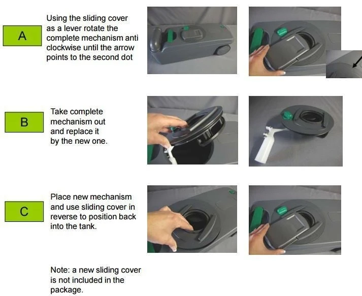 Holding tank mechanisme van Thetford. Vervangingsonderdeel voor een Thetford C400 toilet. Rechter uitvoering.
