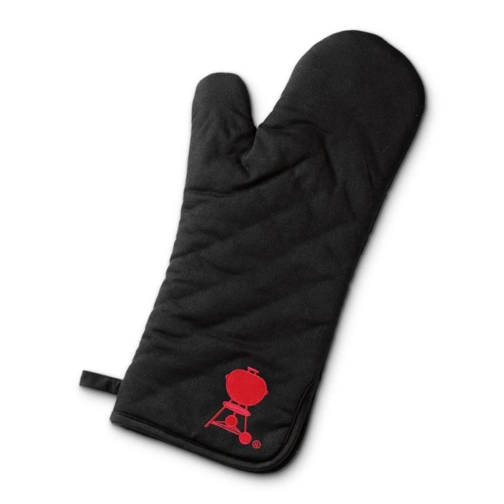 Deze Weber Barbecuewant is extra lang, zo is ook je onderarm beschermd tegen de hitte.